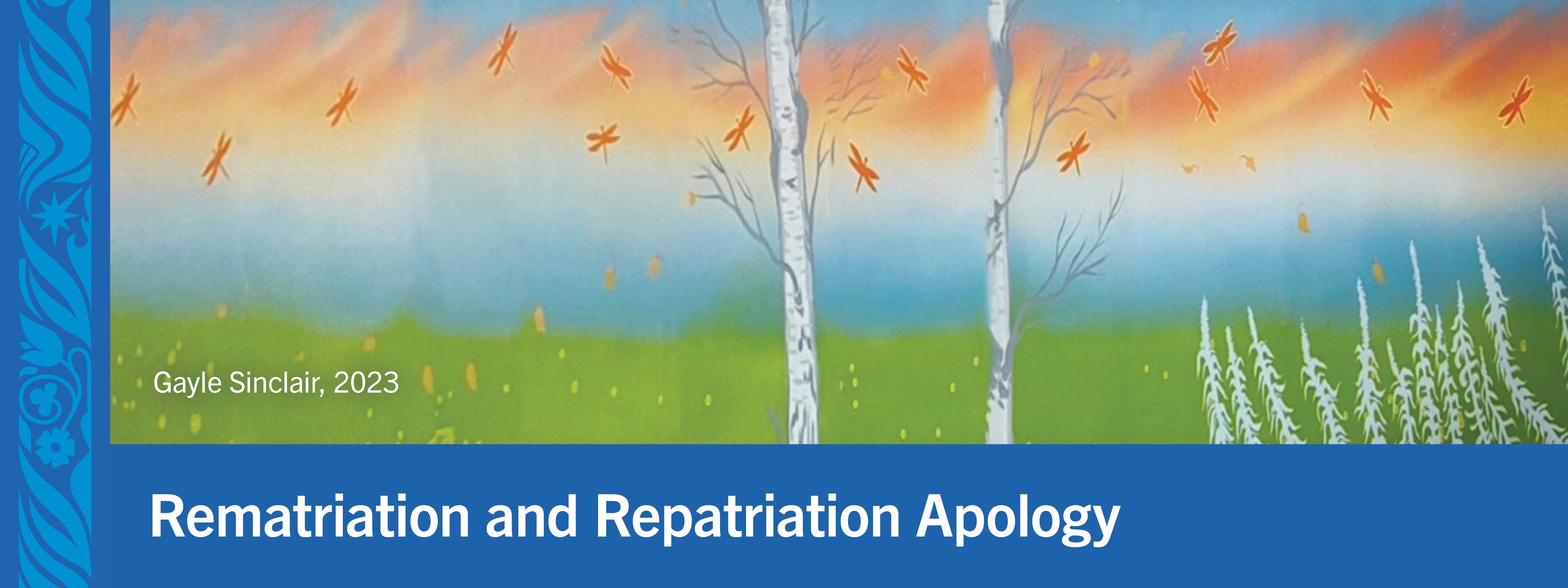 [Painting of birch trees, dragonflies, and growing sage and tobacco in a field of grass with a sunset sky. Text says Rematriation and Repatriation Apology and the artists name, Gayle Sinclair, 2023.]