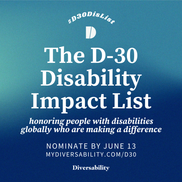 Nominations are now open for Diversability's 2nd annual D-30 Disability Impact List #D30DisList! The list will honor 30 people with disabilities globally making a difference in their community. We hope this will recognize the accomplishments and leadership of our community. You can learn more at this page on our website: http://www.mydiversability.com/d30https://urldefense.com/v3/__http:/www.mydiversability.com/d30__;!!KGKeukY!iJcPxiilWCbYqhp_jqRfeK2ktqqCTVgXfAfq5hfWeBy34ejHhFJoL6kPF4TeI7ku$