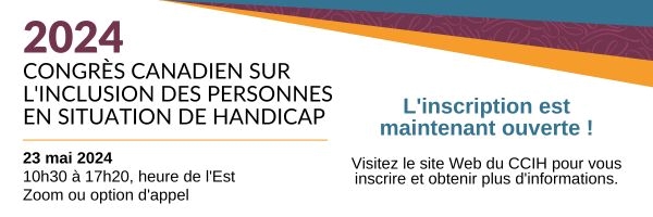[Le troisième Congrès canadien sur l'inclusion des personnes en situation de handicap (CCIH) aura lieu le 23 mai 2024, de 10h30 à 17h20, heure de l'Est. Rejoignez-nous sur Zoom ou par appel téléphonique. L'inscription est maintenant ouverte ! Visitez le site Web du CCIH pour vous inscrire et pour obtenir de plus amples renseignements.]<https://www.canada.ca/fr/emploi-developpement-social/campagne/congres-canadien-inclusion-personnes-situation-handicap.html>