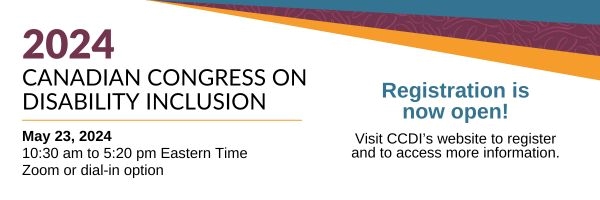 [The third annual Canadian Congress on Disability Inclusion (CCDI) will take place on May 23, 2024, from 10:30 am to 5:20 pm Eastern Time. Join us on Zoom or dial-in option. Registration is now open! Visit CCDI’s website to register and to access more information.]https://www.canada.ca/en/employment-social-development/campaigns/canadian-congress-disability-inclusion.html